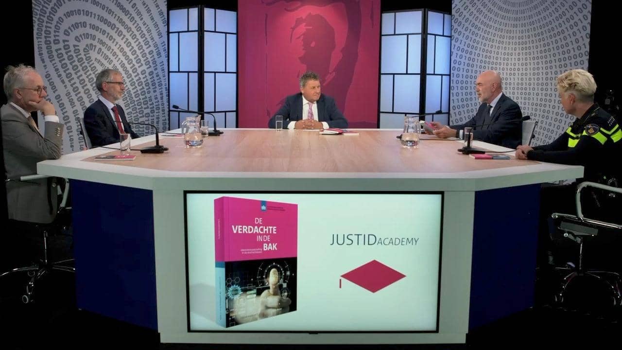 (Het Nederlandse wapenschild met daarnaast: Justitiële Informatiedienst. Ministerie van Justitie en Veiligheid. Het logo van de Justid Academy. Een presentator en z'n gasten zitten aan een tafel:)