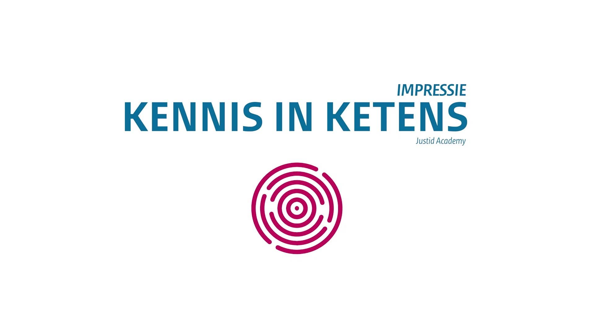 (EEN CIRKEL MET VIJF ROZE RINGEN VERSCHIJNT. DE CIRKEL WORDT VOLLEDIG ROZE EN DAN WORDEN HET WEER VIJF RINGEN. UITEINDELIJK WORDT HET EEN ROND DOOLHOF. ERBOVEN VERSCHIJNT DE TEKST: KENNIS IN KETENS)
